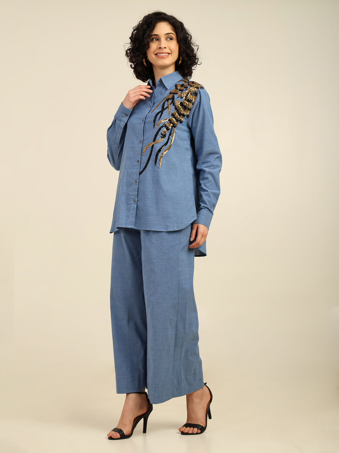 Sequnece Embroidered Chambray Cotton Coord Set With Wide Leg Pants