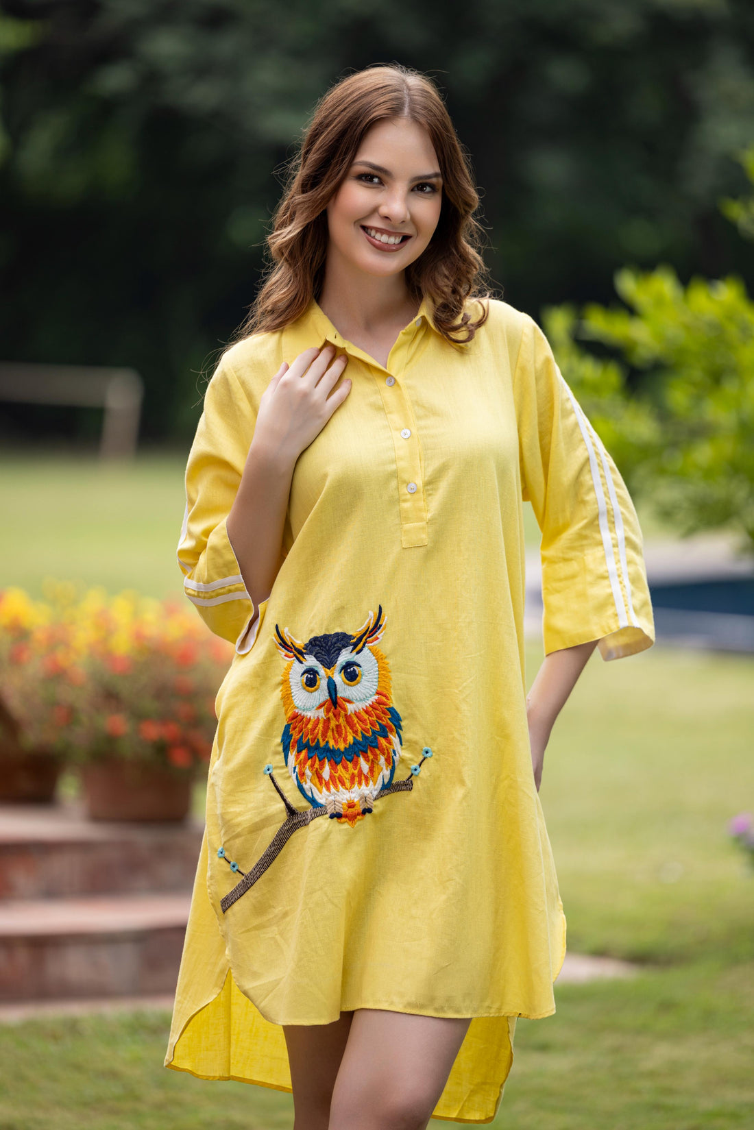 Owl Tales Lemon Yellow Cotton Long Shirt with Lace Detailing