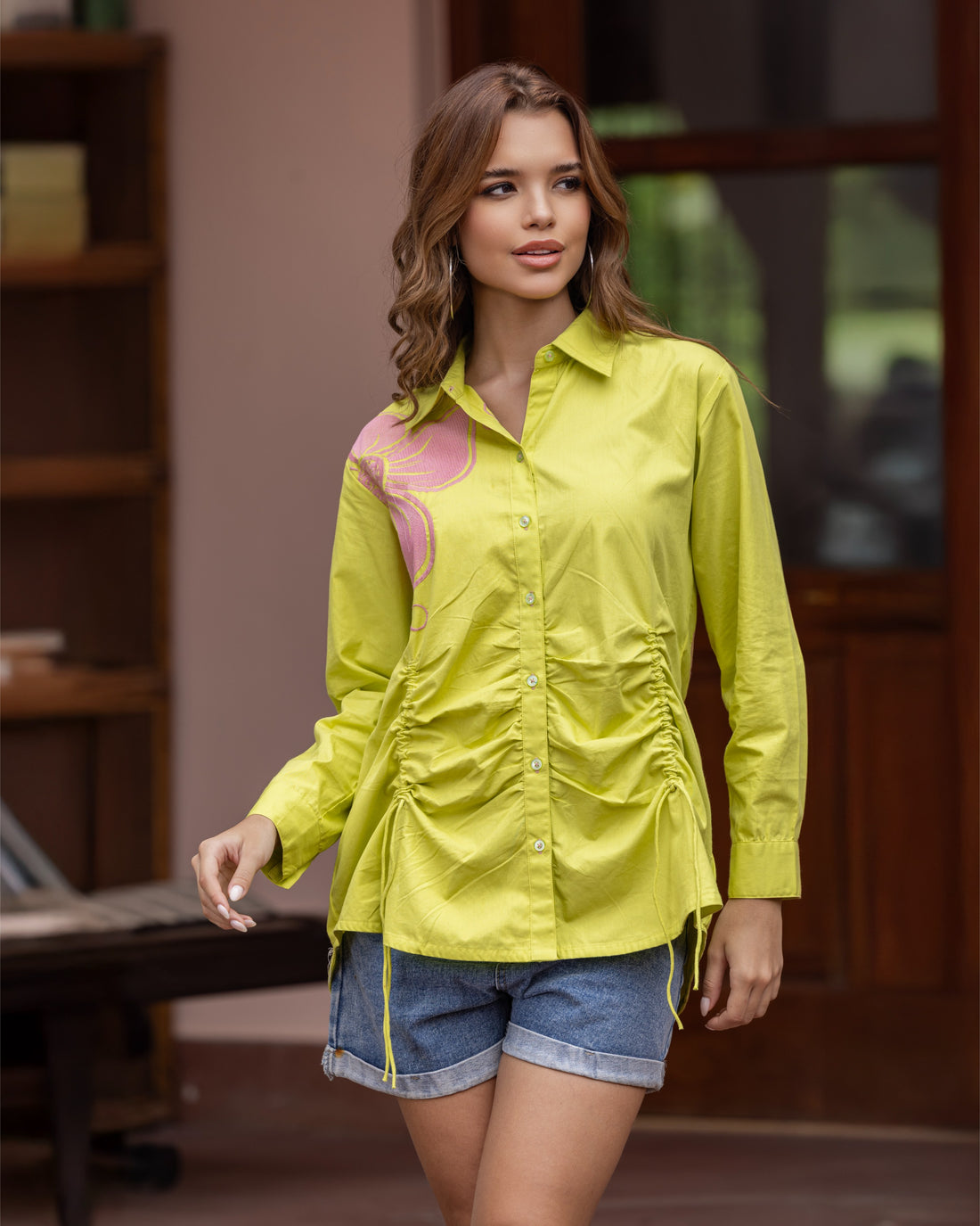 Lime Green Floarl Front & Back Embroiered Shirt with Drawstring Detailing