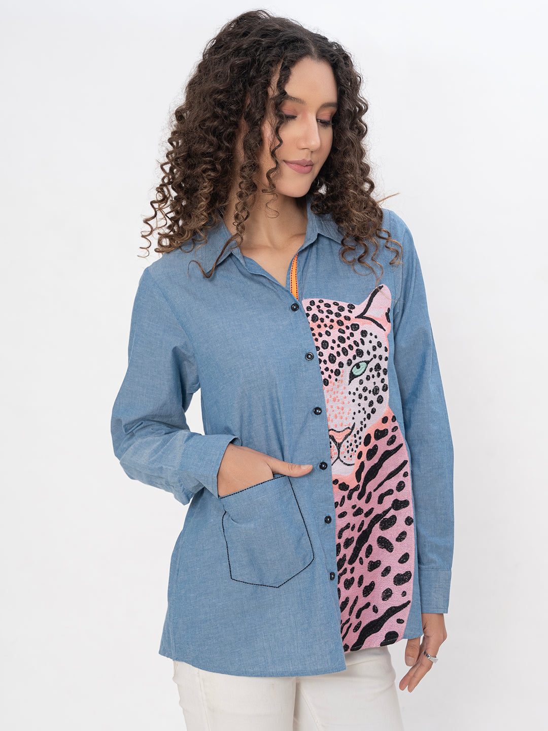 DENIM FRONT EMBROIDERED COTTON SHIRT ( Diwali )