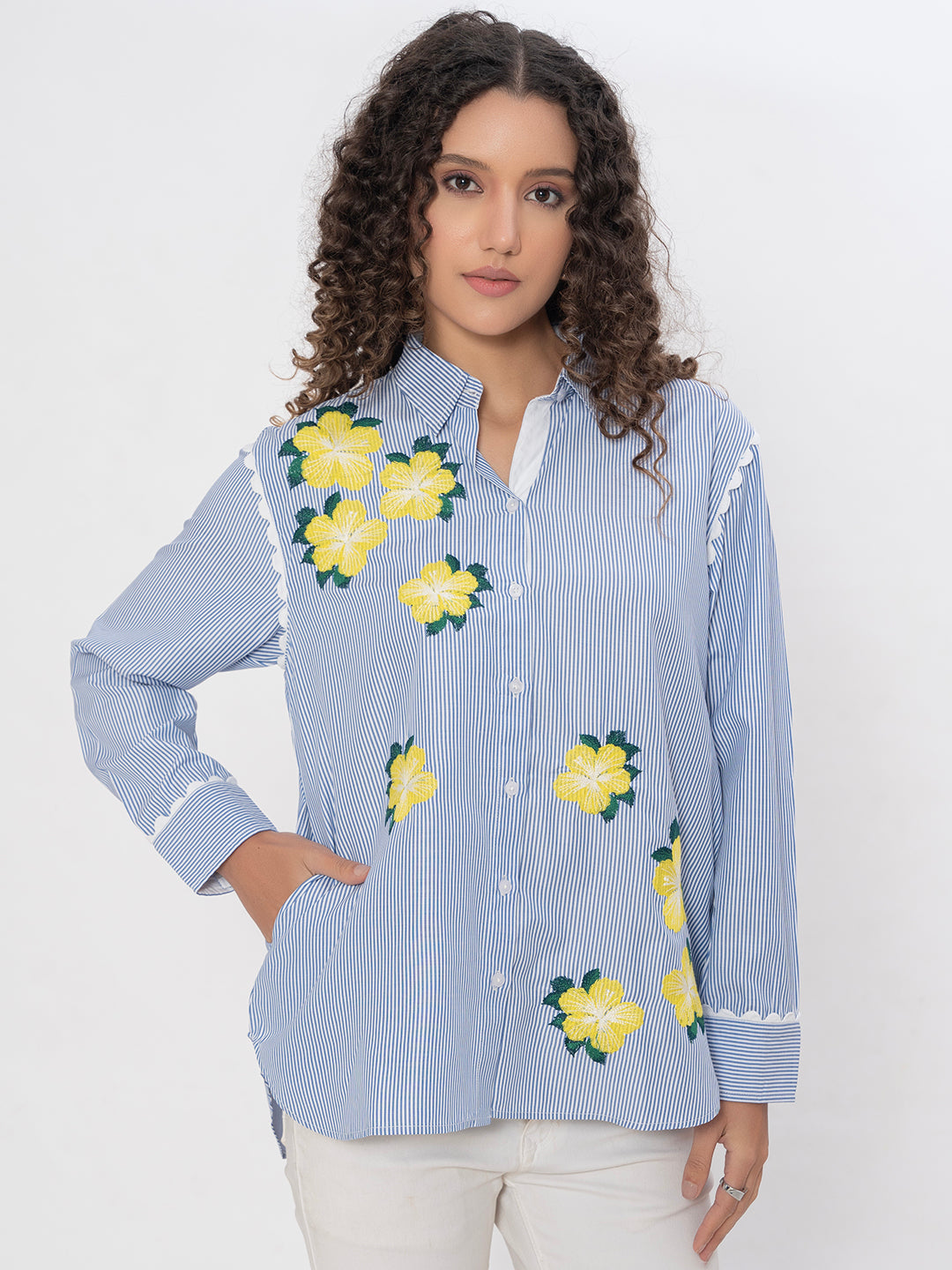 STRIPE FLORAL FRONT AND BACK EMBROIDERED COTTON SHIRT ( Diwali )