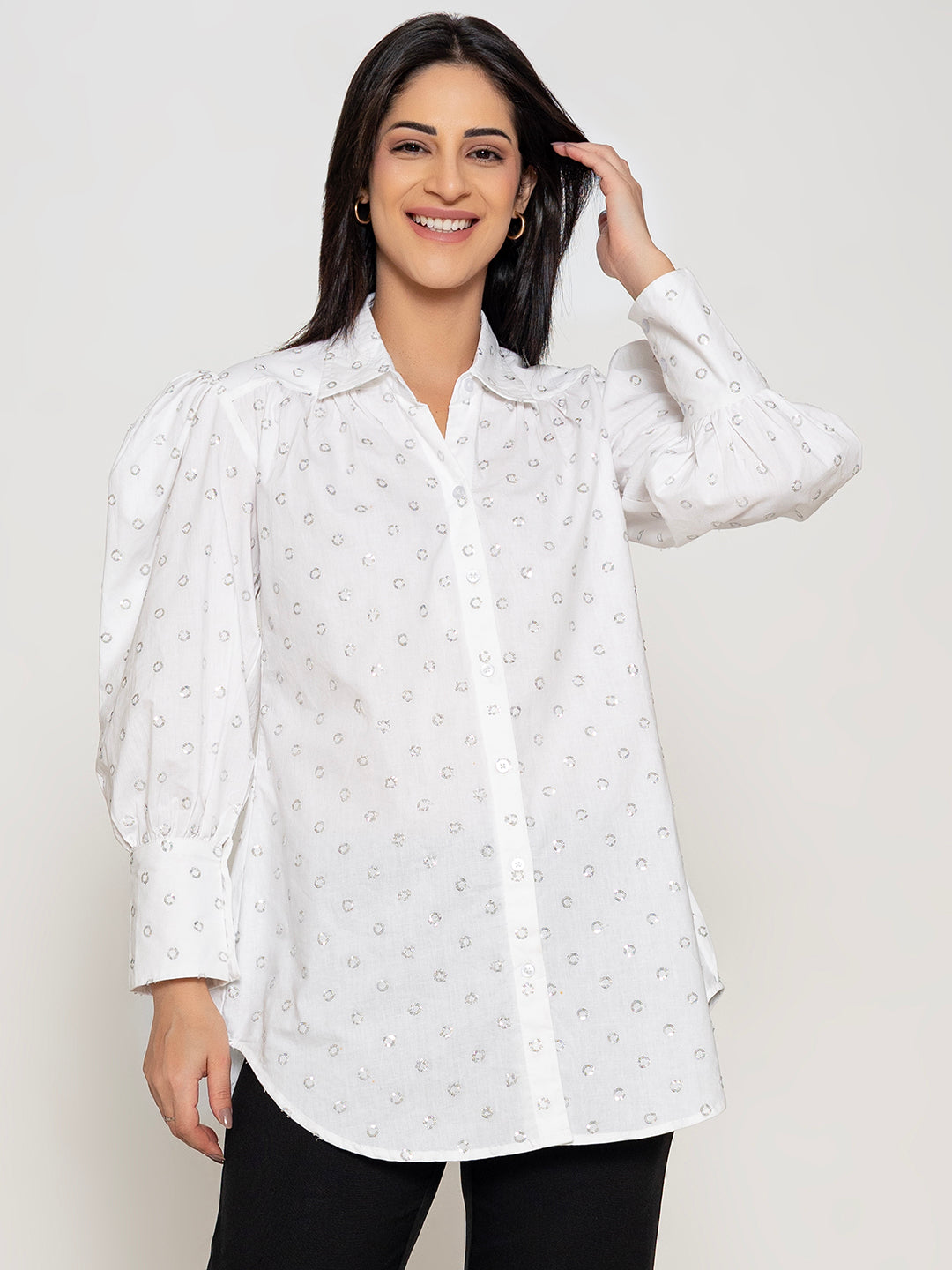 Step into subtle glamour with this stunning white shirt, adorned with sequin embroidery on both...