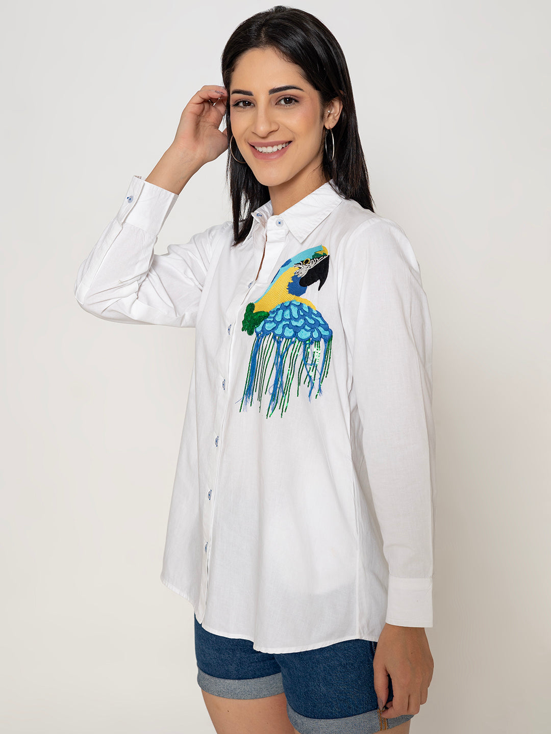 White Macaw Embroidered Cotton Shirt with Hanging Sequins Make a bold yet graceful style statement...
