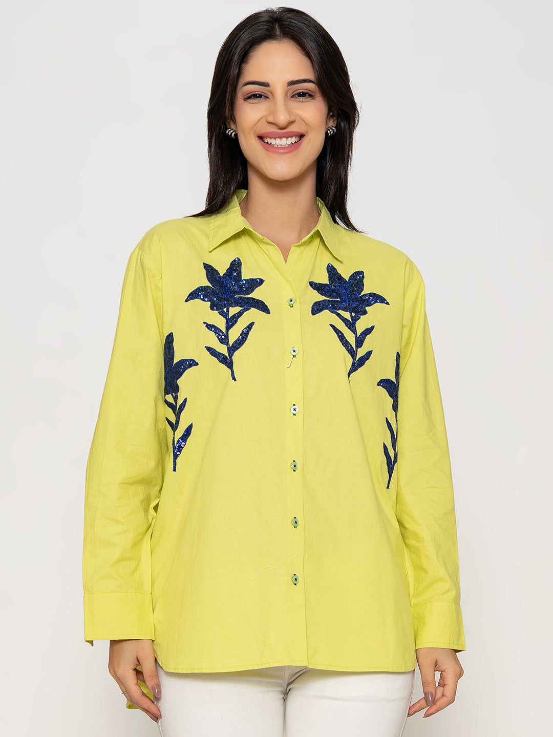 Lime Green Sequin Embroidered Cotton Shirt Brighten up your wardrobe with this refreshing lime green...