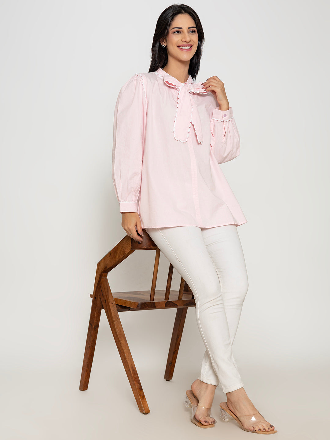ROSY PINK FULL SLEEVE FRONT BOW SHIRT WITH LACE DETAILING