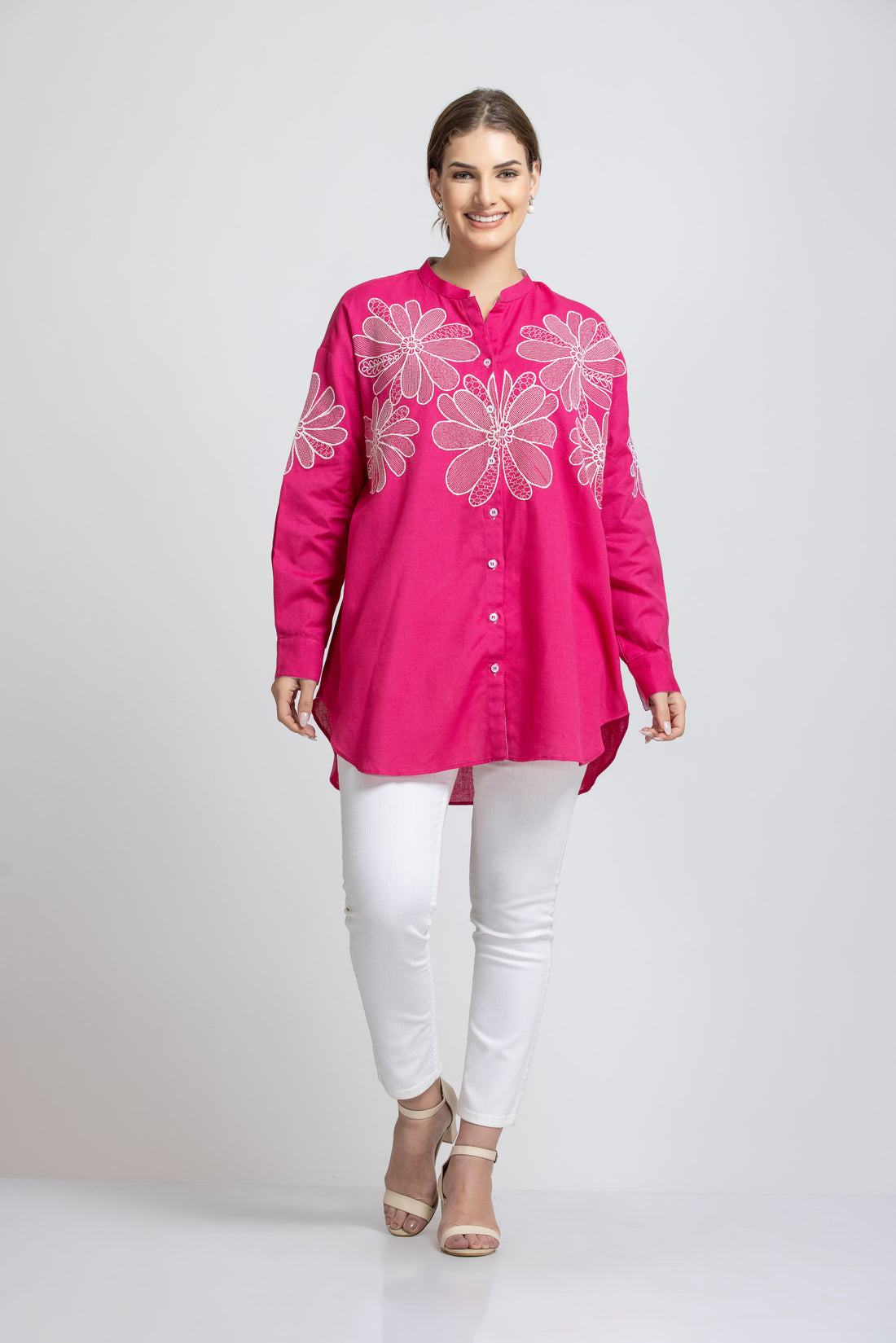 SOLID COLOR FRONT EMBROIDERED LONG SHIRT.