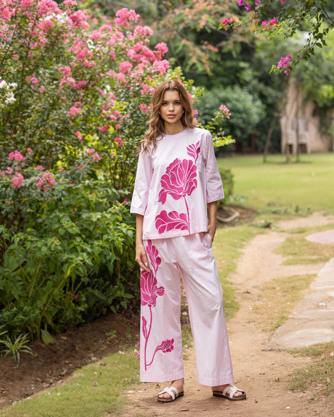 Floral Embroidered Back Slit Pink Cotton Coord Set