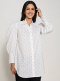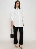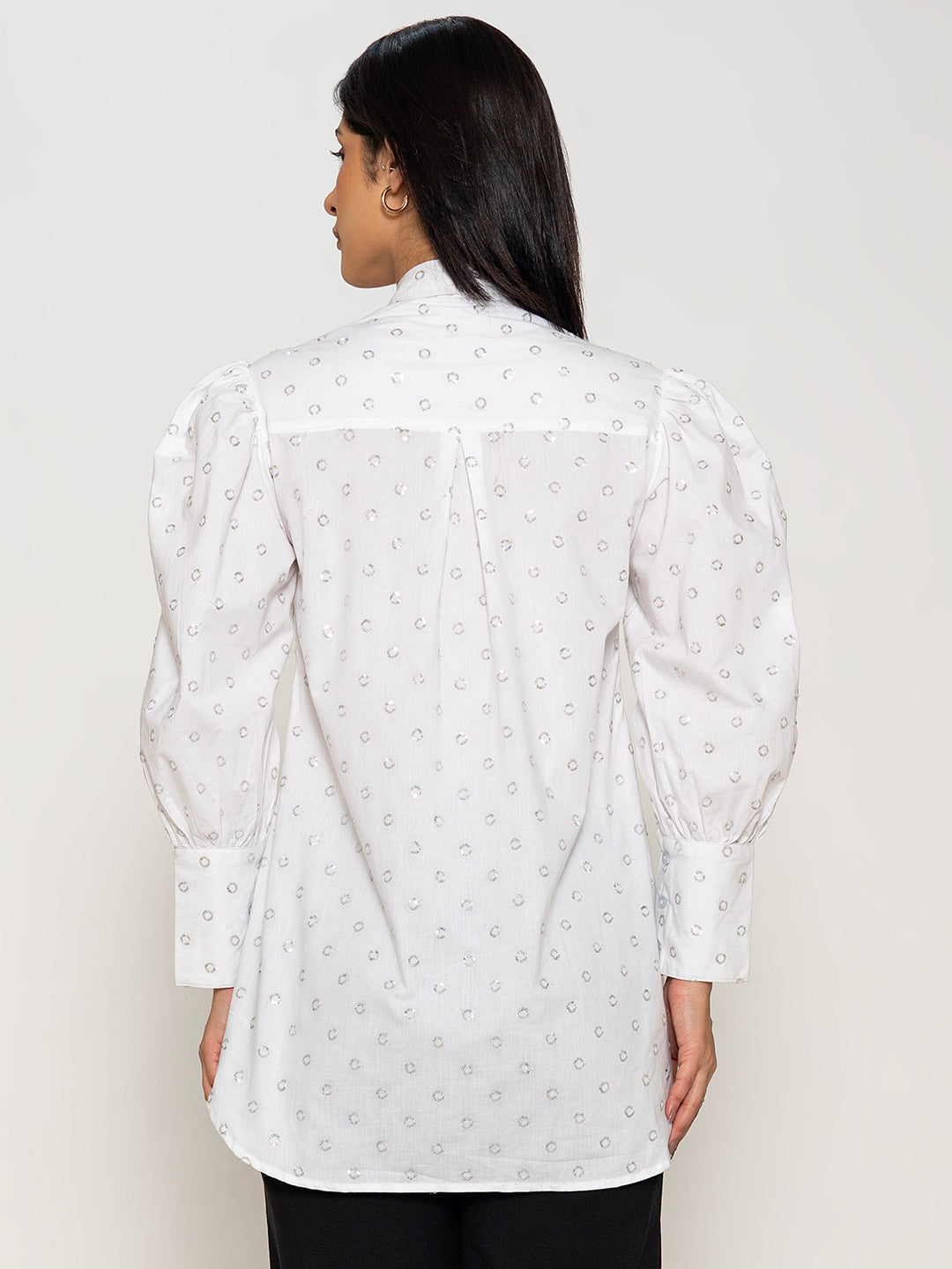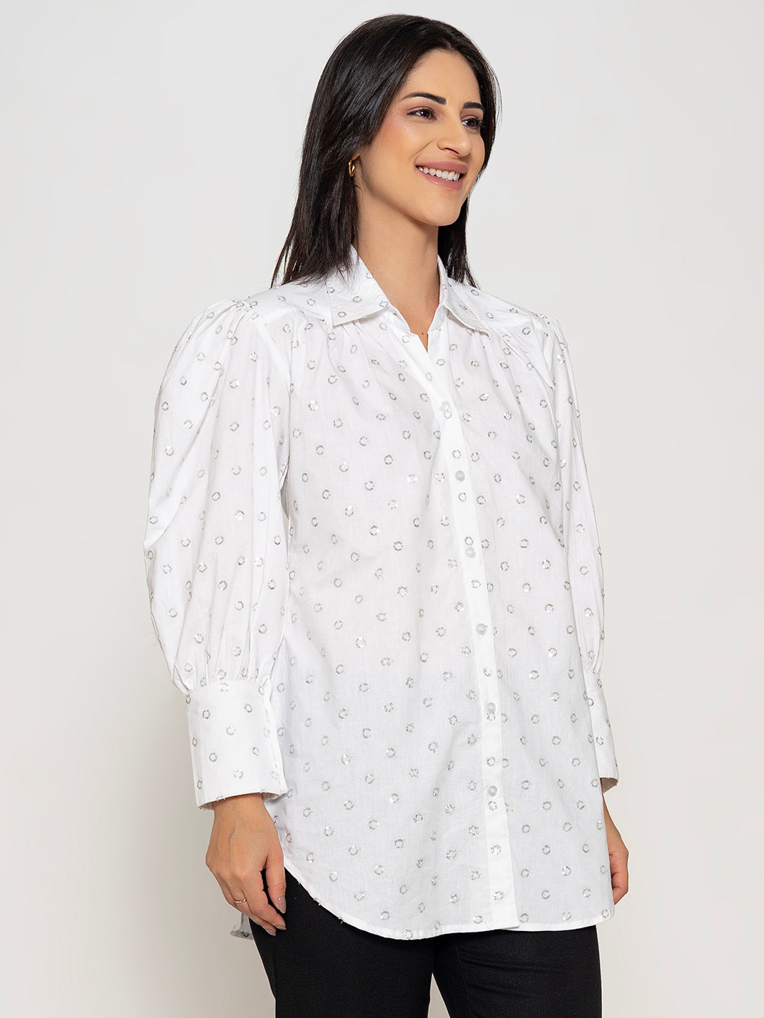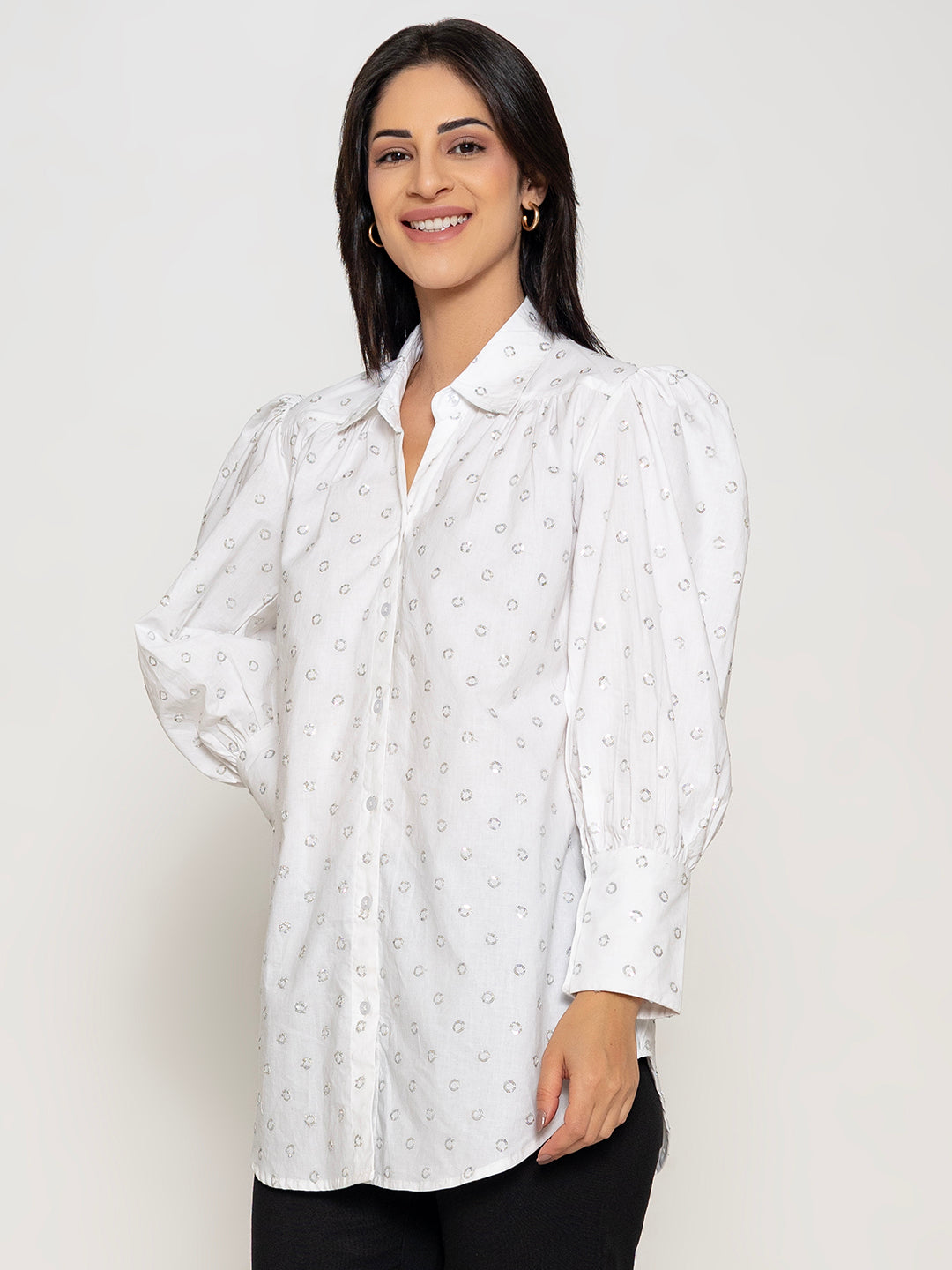 Add a dash of glam to your everyday wardrobe with this all-over sequin embroidered cotton shirt. Crafted for comfort but designed to shine, this piece blends breathable cotton with understated shimmer—making it perfect for day-to-night transitions. Pair it with trousers for a polished look or wear it open over a cami for a relaxed vibe.