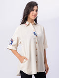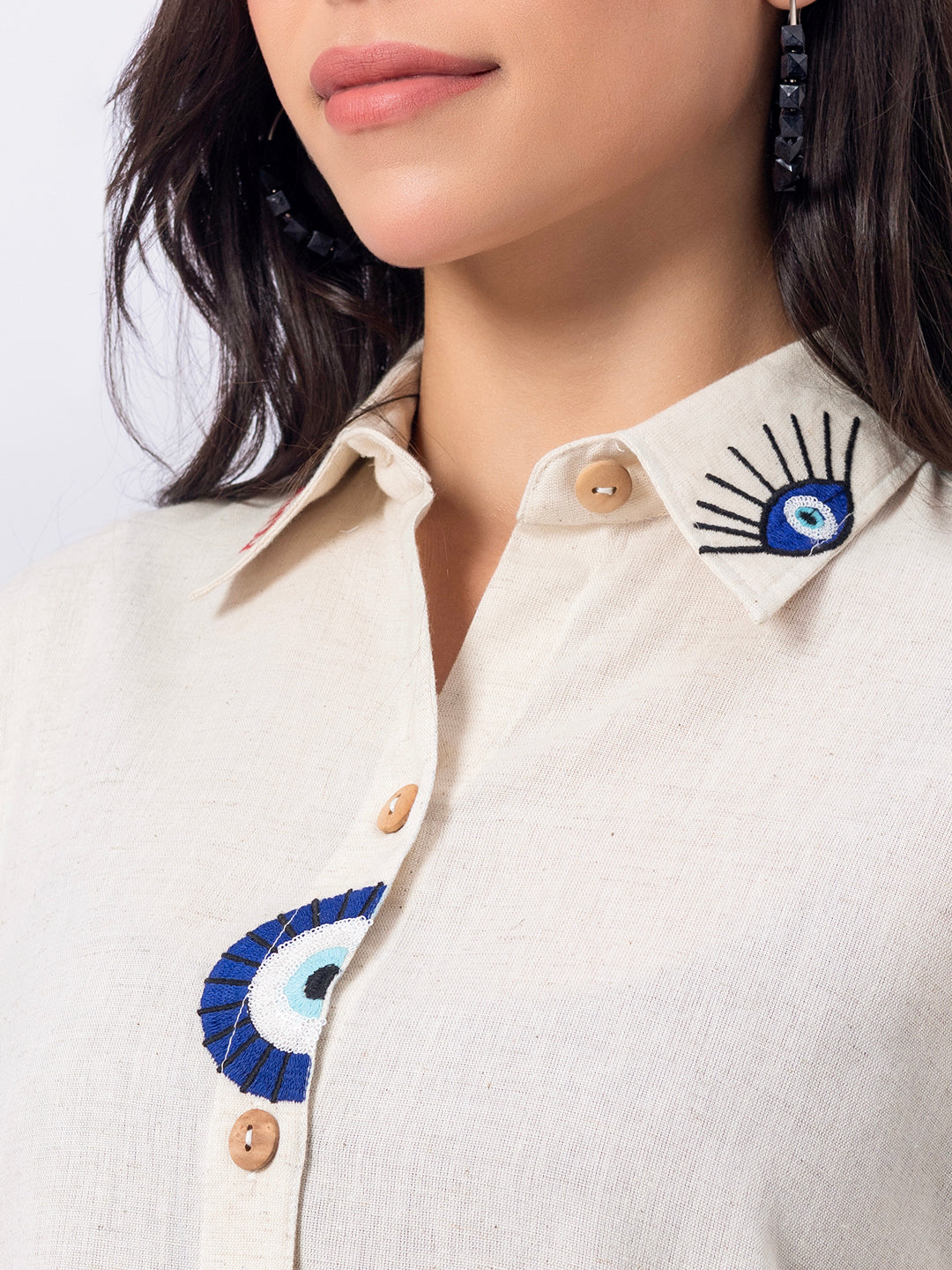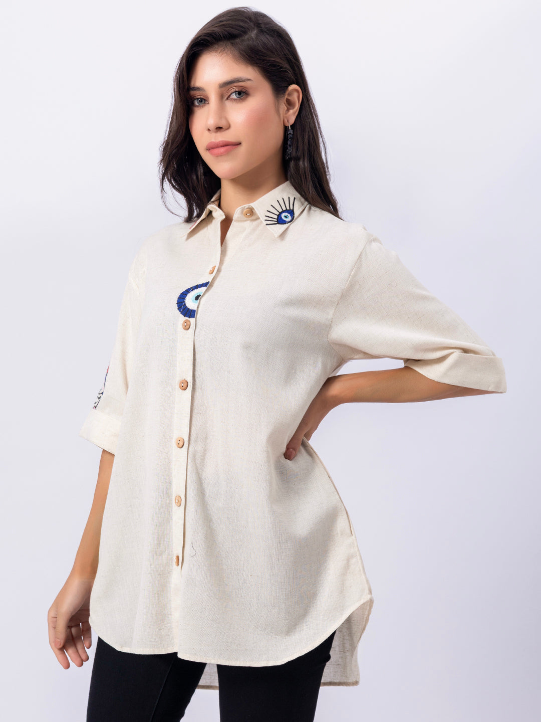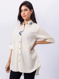 BEIGE COLOR FRONT, COLLAR & SLEEVE EMBROIDERED COTTON QUARTER SLEEVE SHIRT ( Diwali )