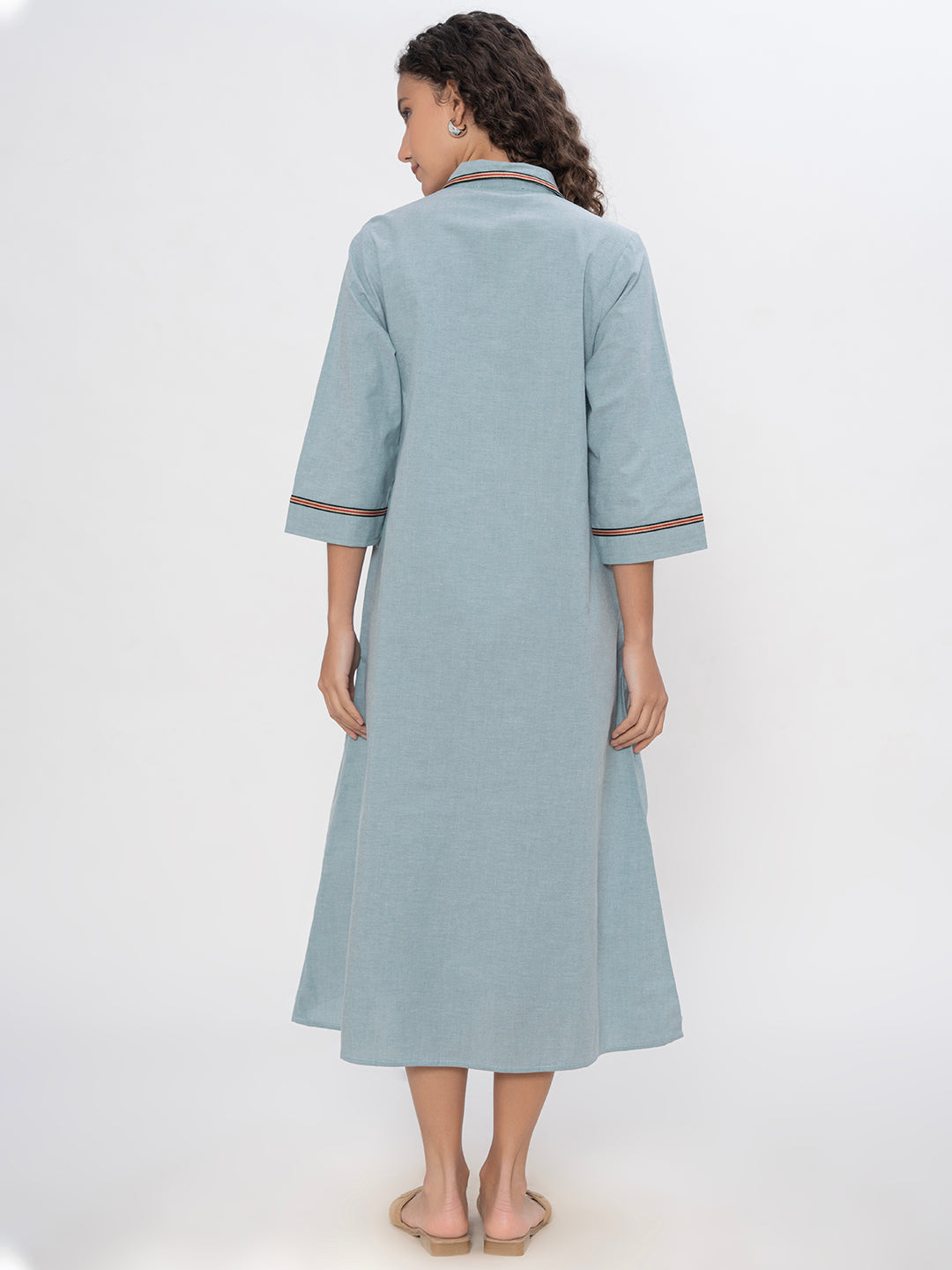 DENIM FRONT FLORAL EMBROIDERED SHIRT DRESS WITH PATCH POCKET