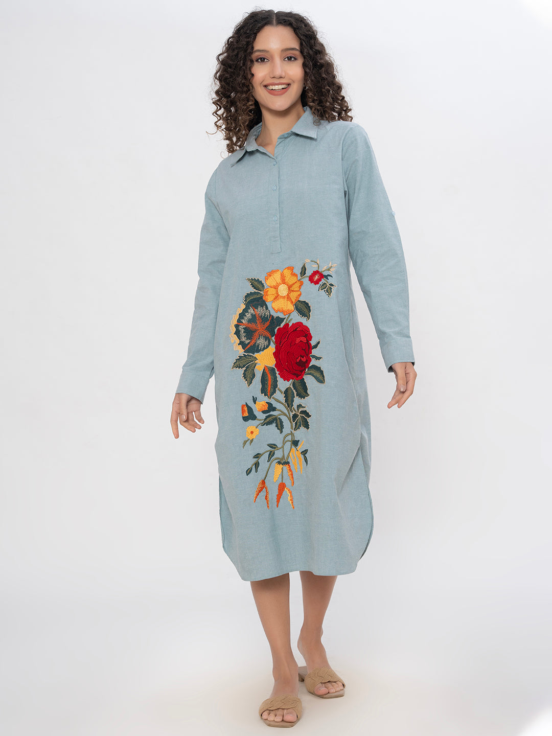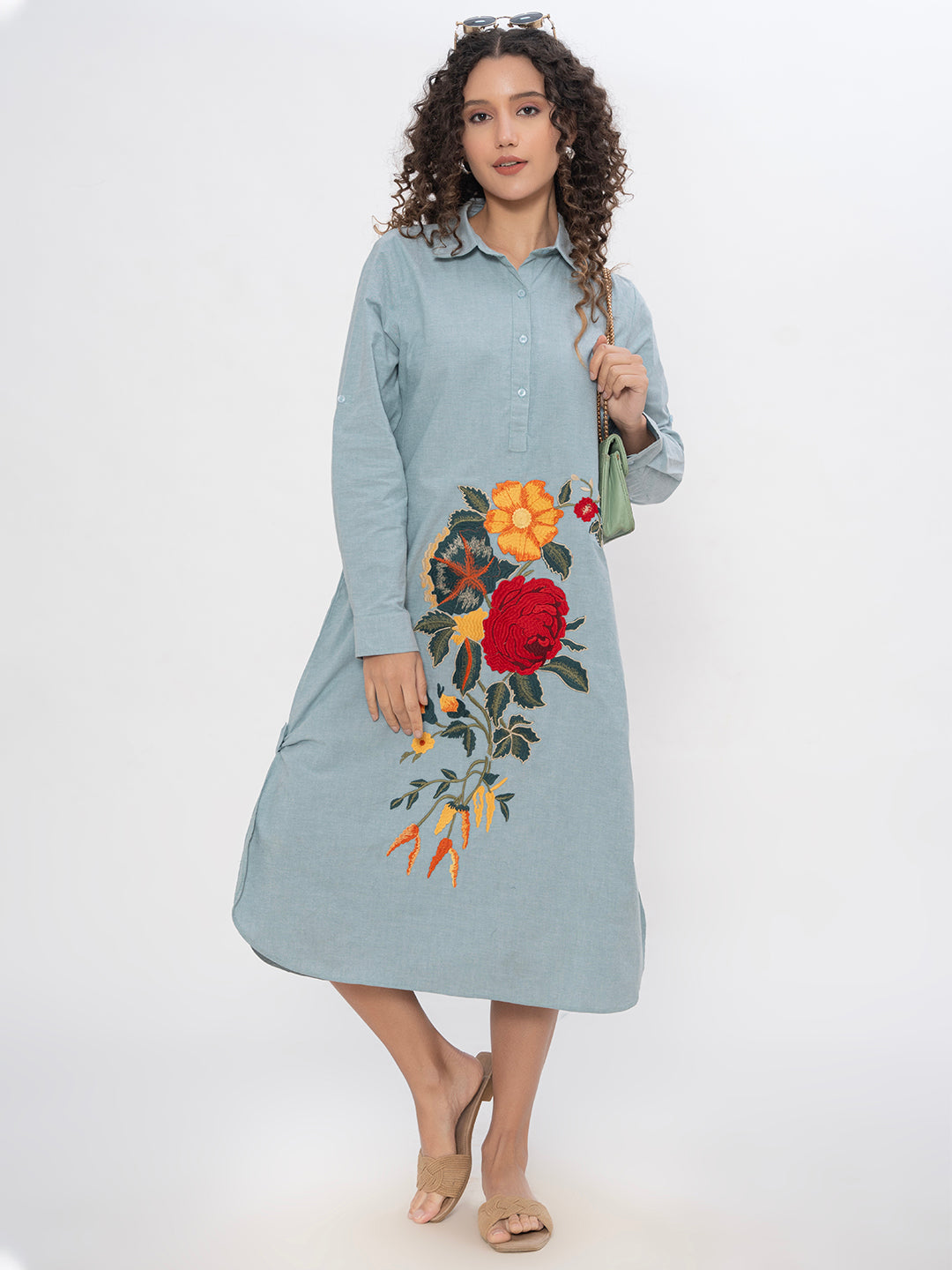 DENIM FRONT FLORAL EMBROIDERED SHIRT DRESS WITH SIDE SLITS