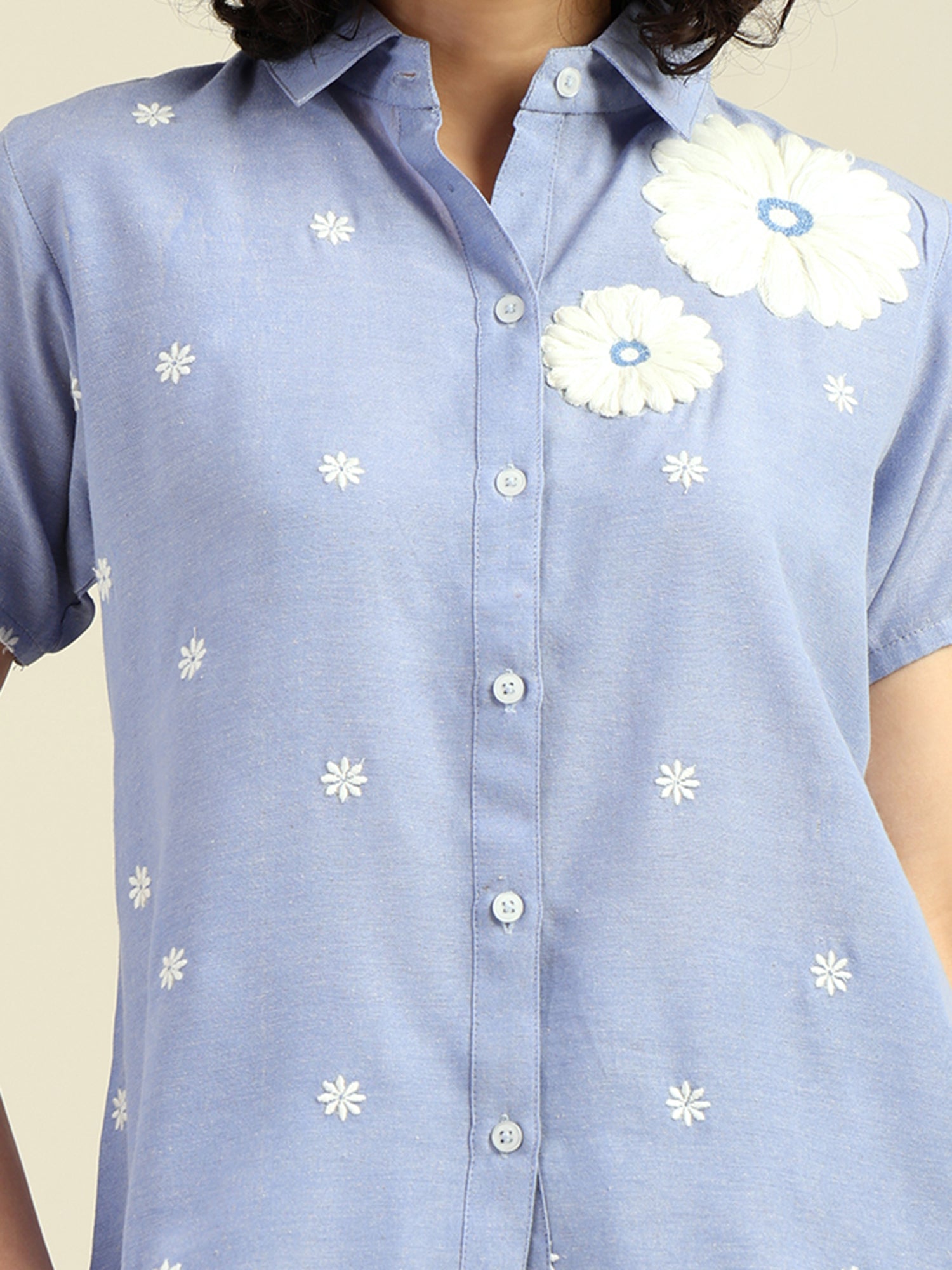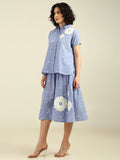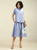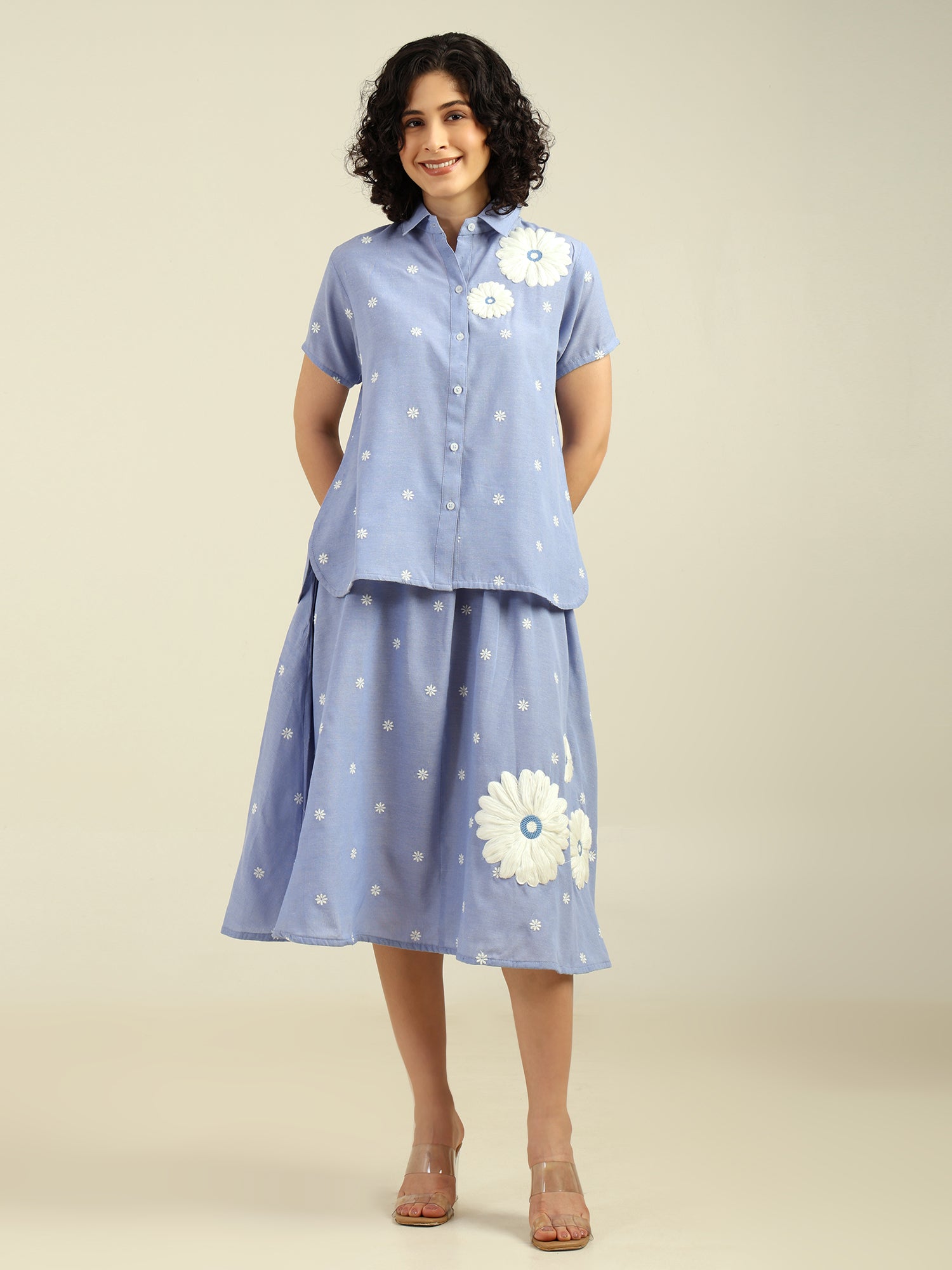 Floral Embroidered Chambray Cotton Shirt & Skirt Set