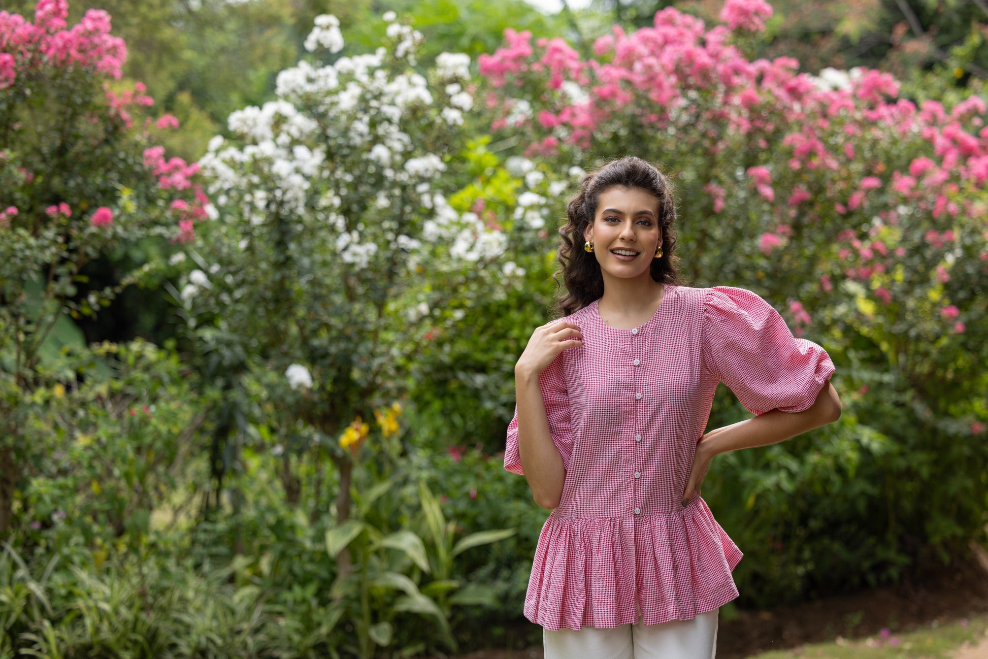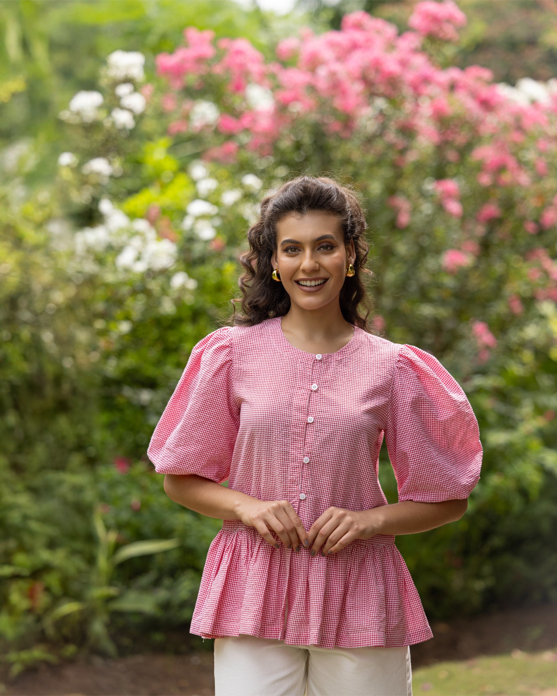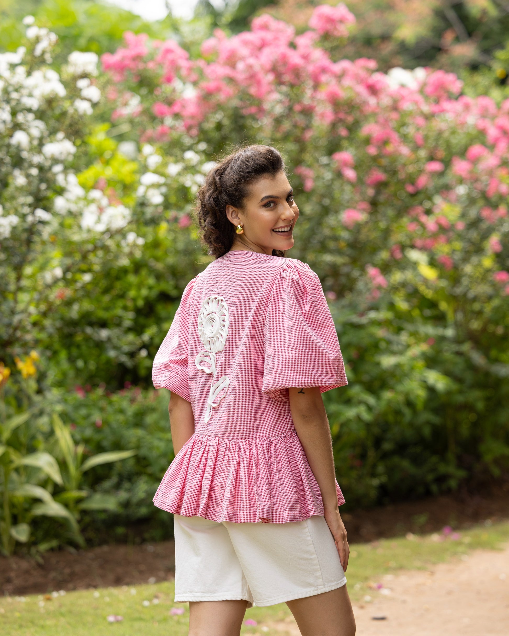 Red & White Gingham Check Back Ribbon Floral Detailing With Puff Sleeves
