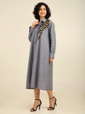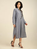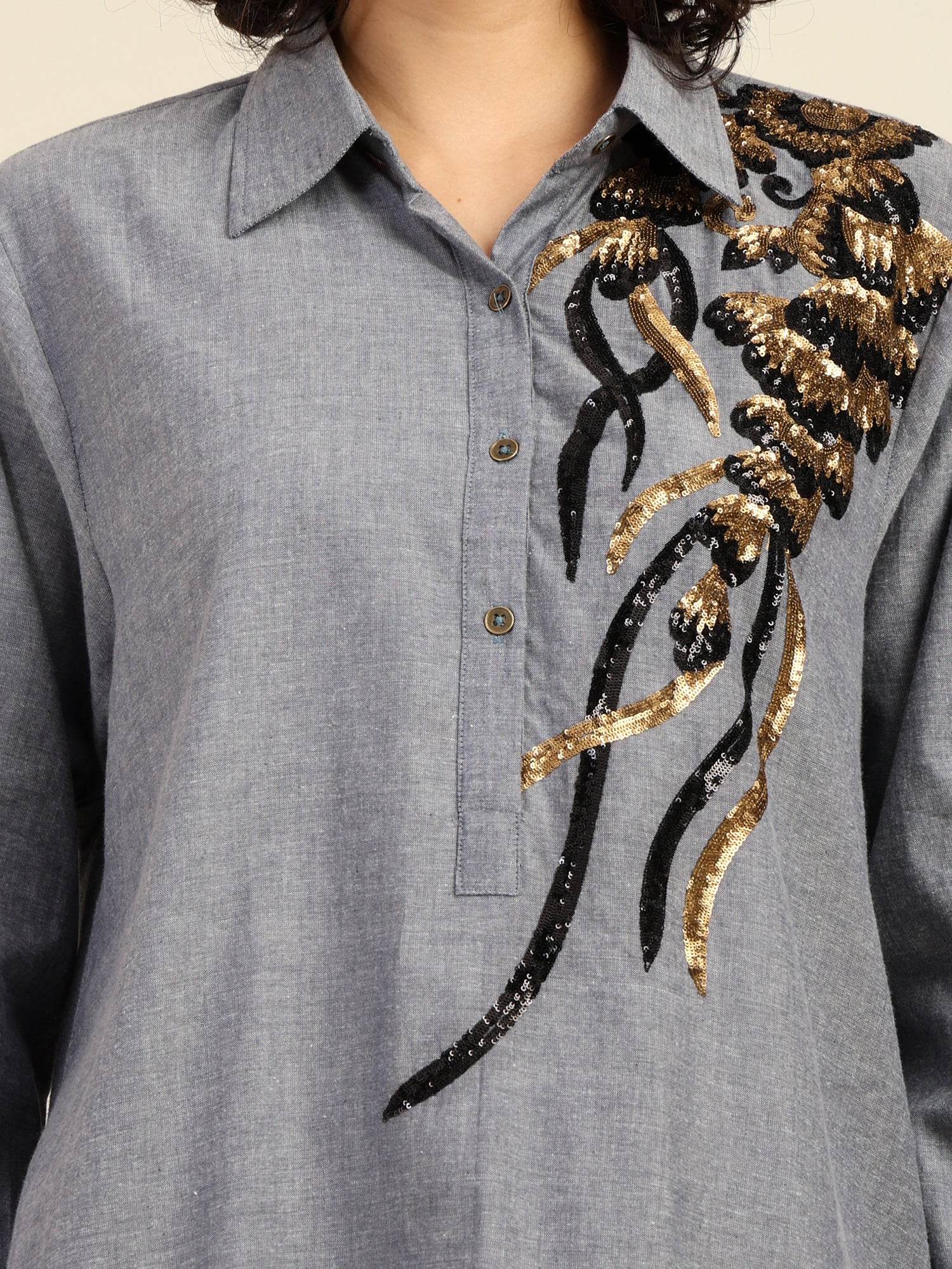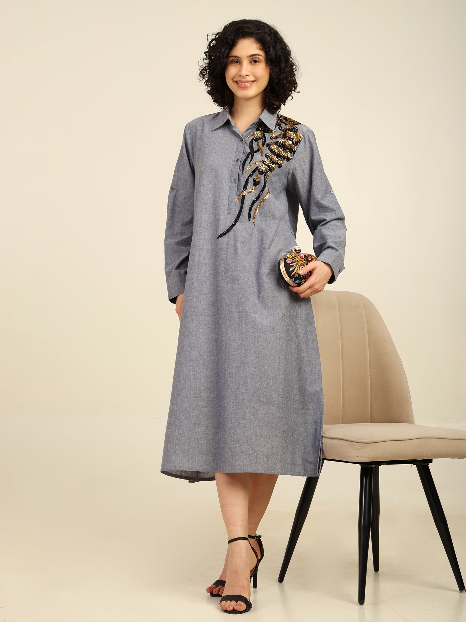 Sequnece Embroidered Chambray Cotton Long Shirt Dress with Side Slit