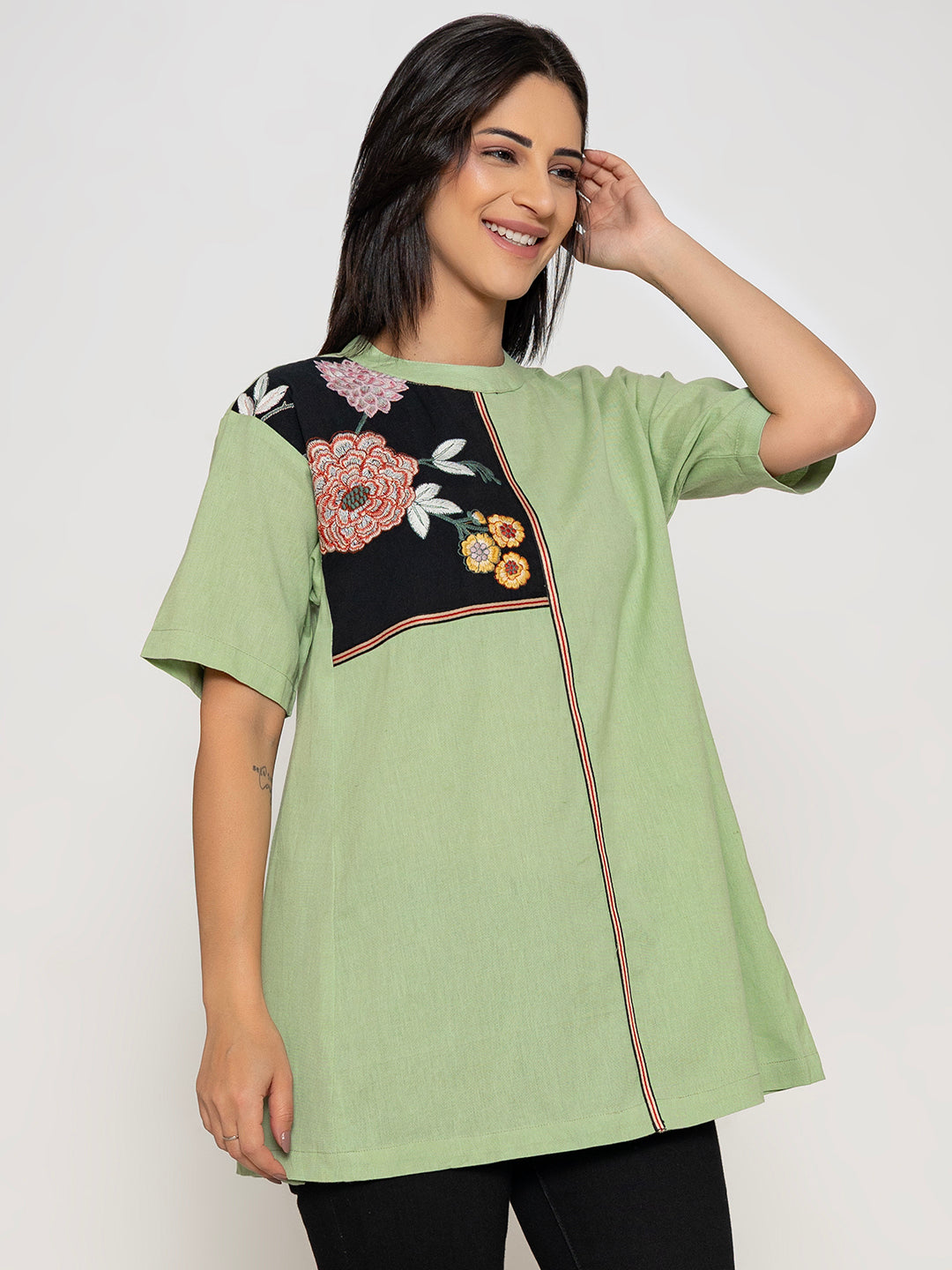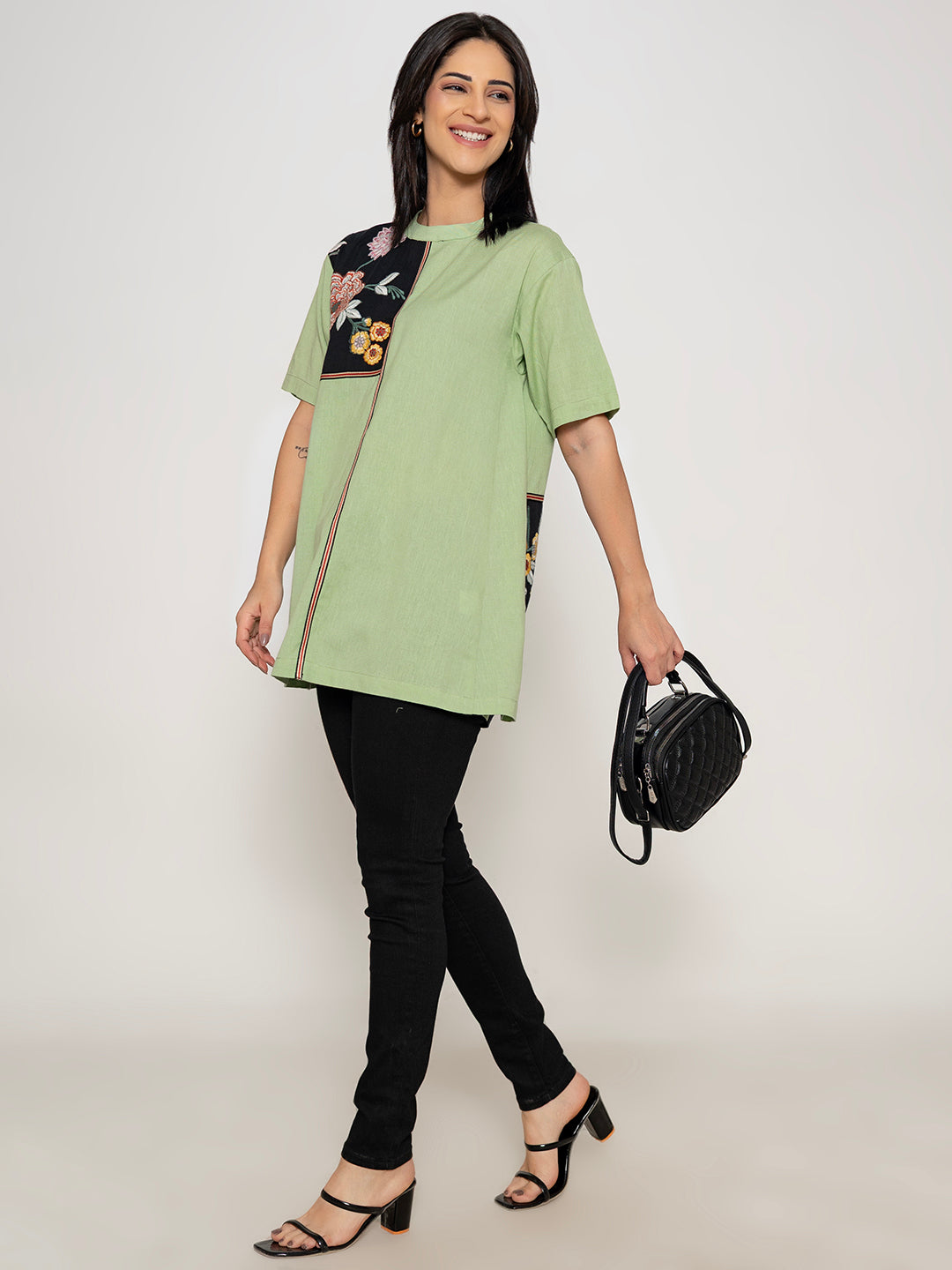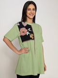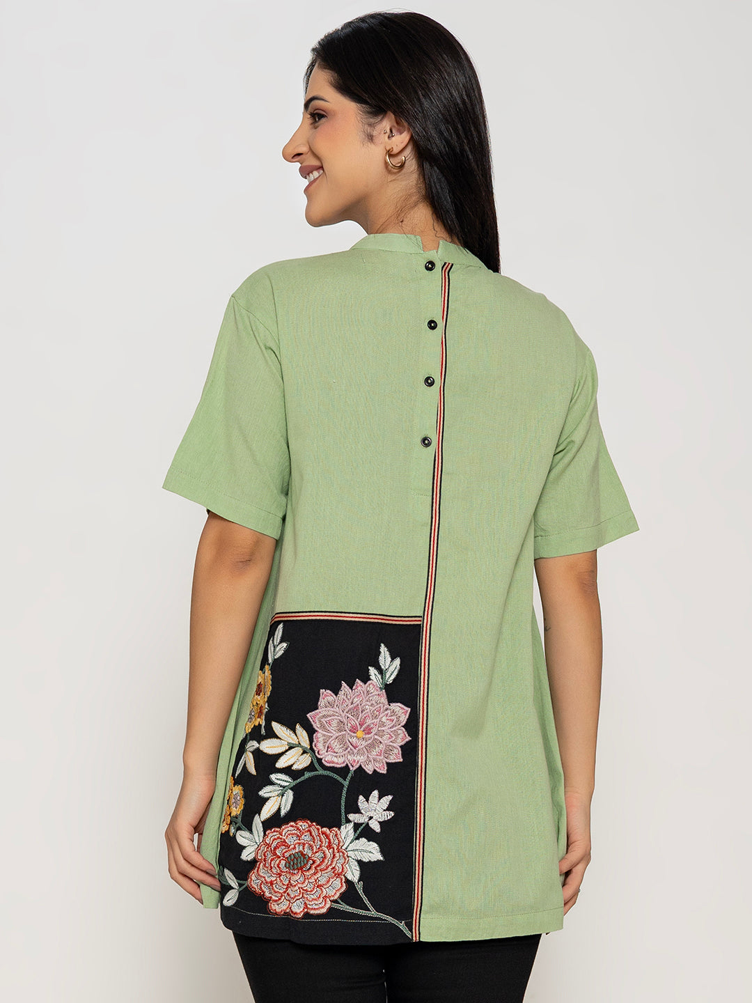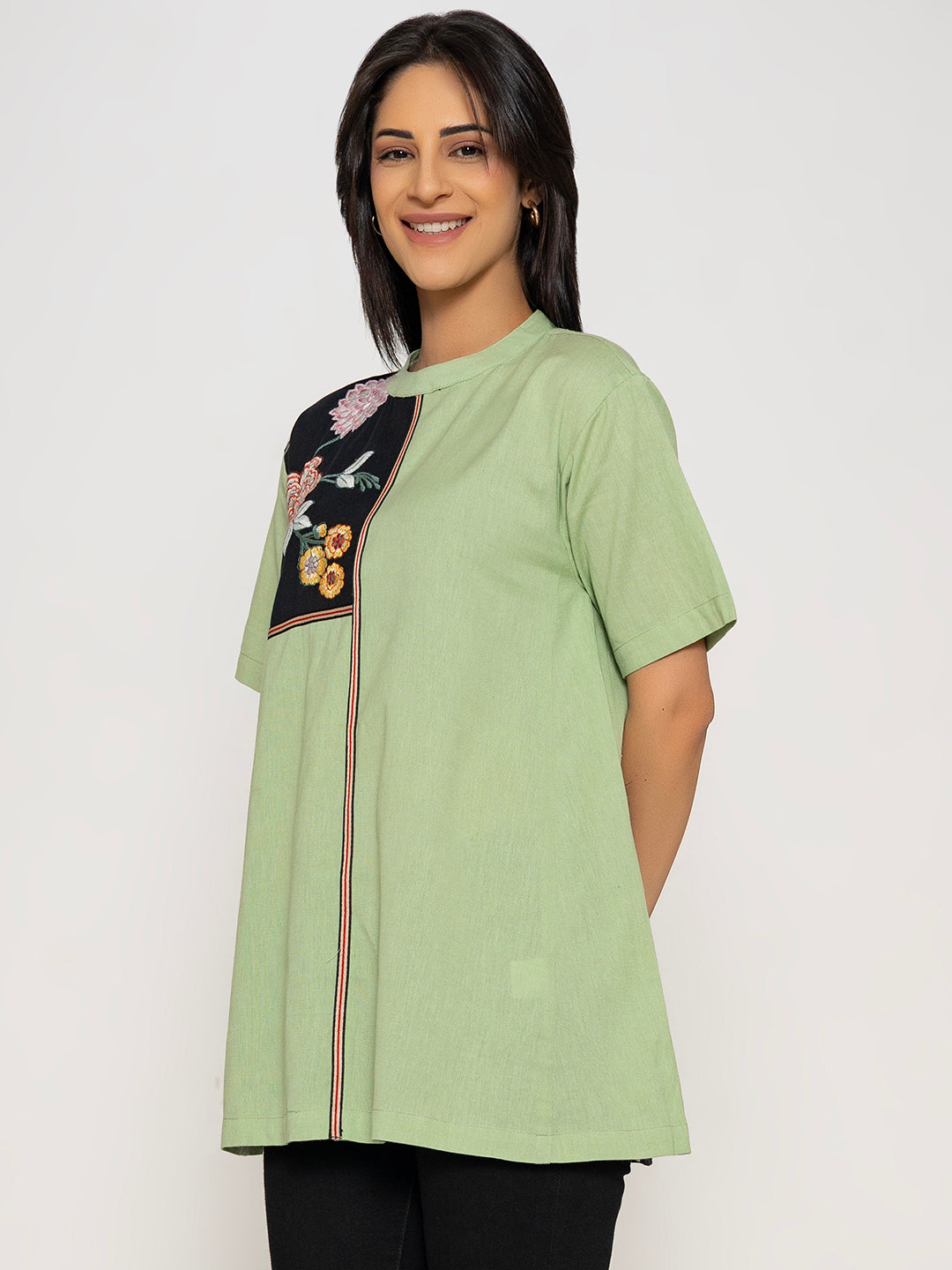 Step into softness with this beautifully crafted softmint cotton shirt featuring delicate embroidery on both front and back. Finished with intricate lace detailing, it strikes the perfect balance between subtle sophistication and everyday charm—perfect for daytime outings or laid-back evenings.