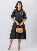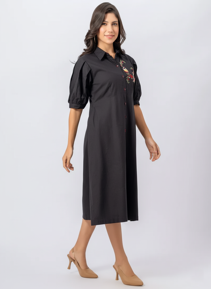 SOLID COLOR FRON EMBROIDERED SHIRT DRESS WITH PUFF SLEEVES