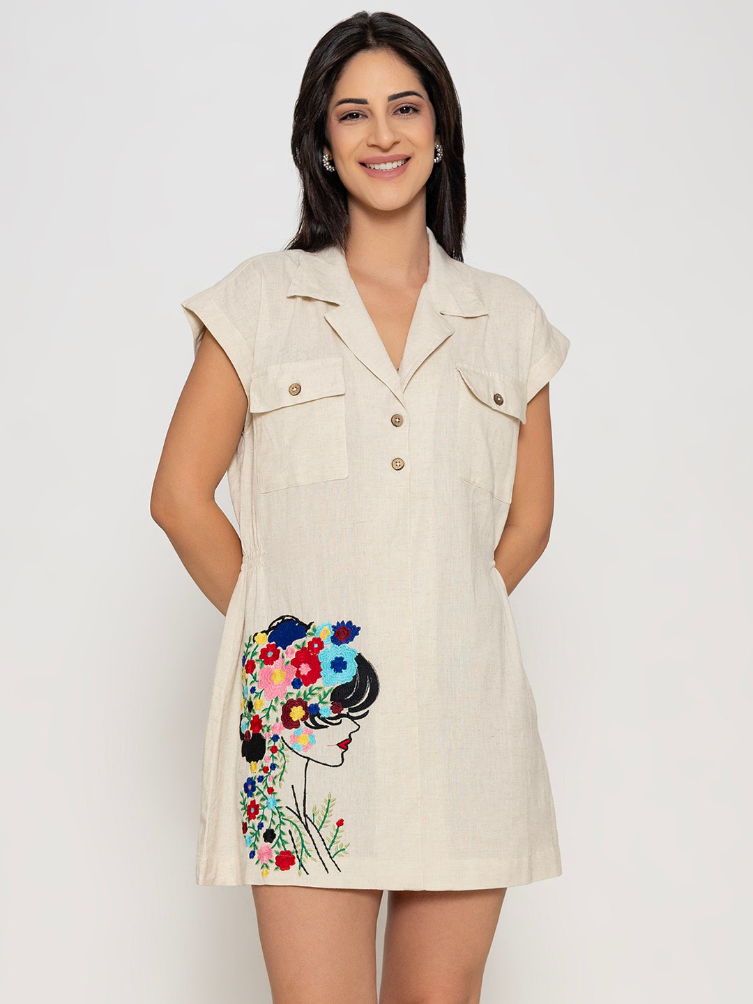 SOLID COLOR FRONT EMBROIDERED NOTCH LAPEL COLLAR COTTON DRESS