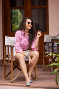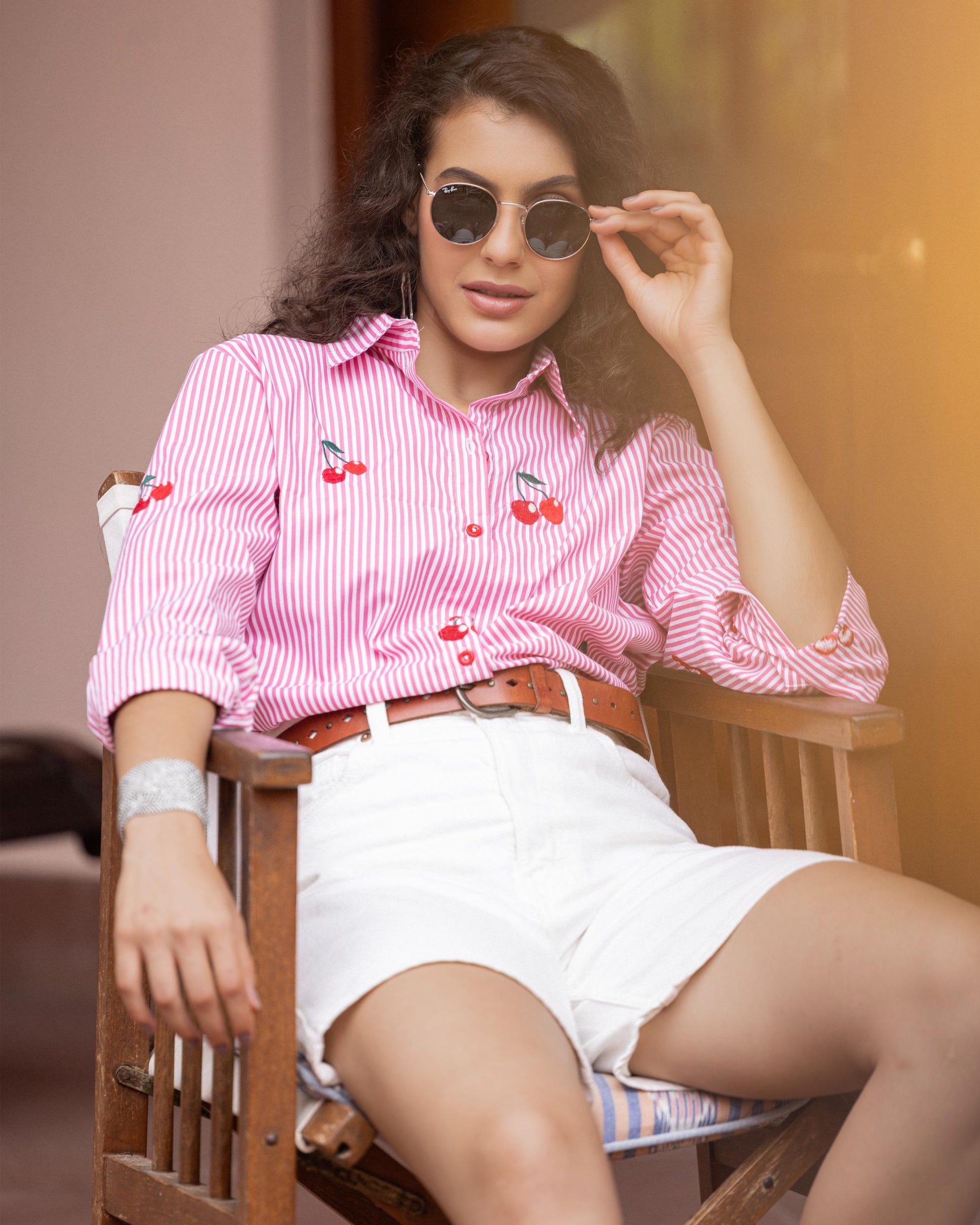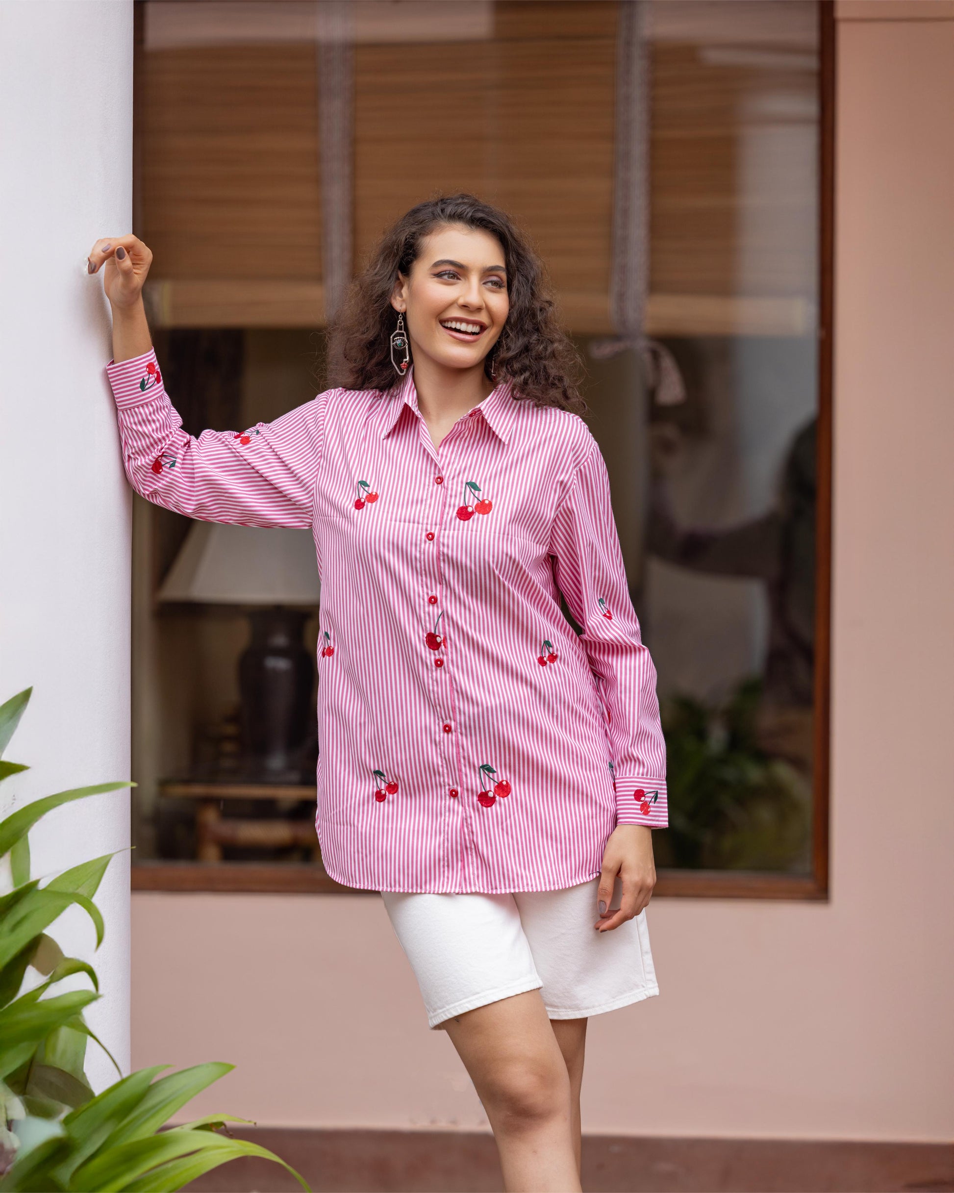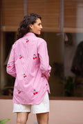 Vertical Pink Striped Cherry Embroidered Cotton Shirt ( Diwali )