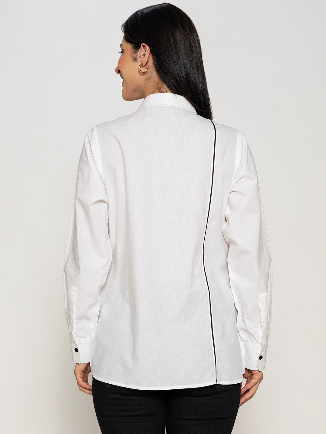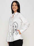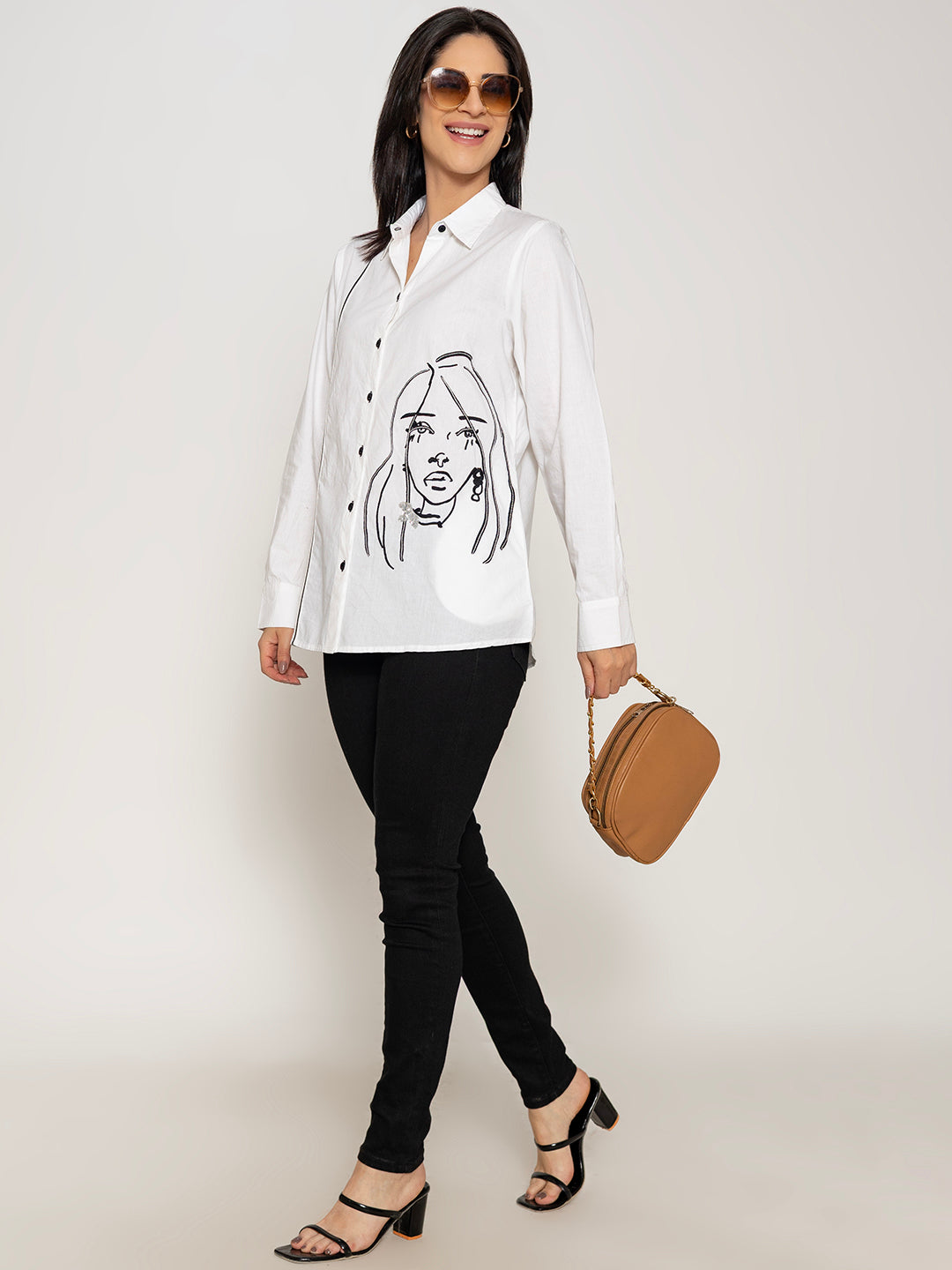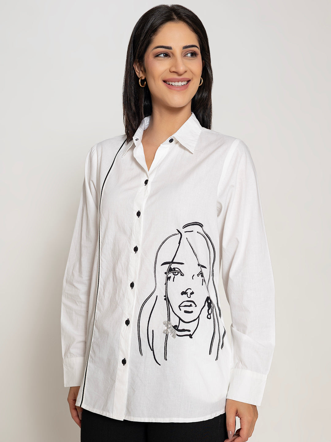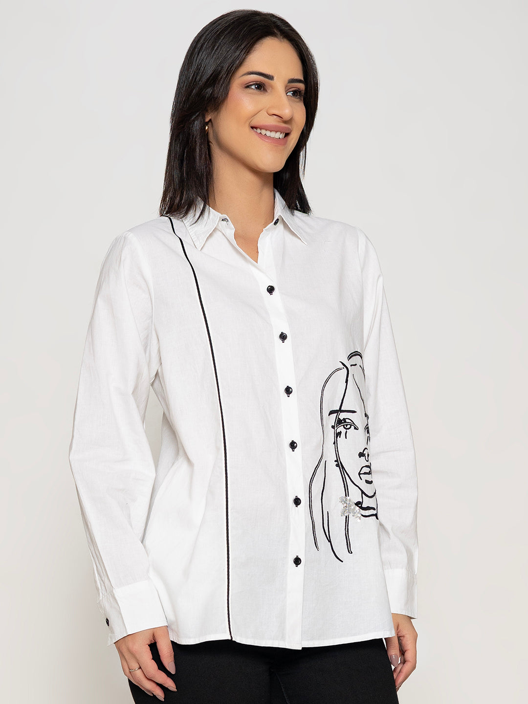 Make a bold yet graceful style statement with this elegant white cotton shirt featuring a vibrant macaw embroidery on the front, enhanced by delicate hanging sequin detailing. Crafted from premium cotton, this shirt offers breathable comfort and a unique touch of artistry. Perfect for brunches, day outings, or creative workspaces—this piece adds playful elegance to your wardrobe with every wear.