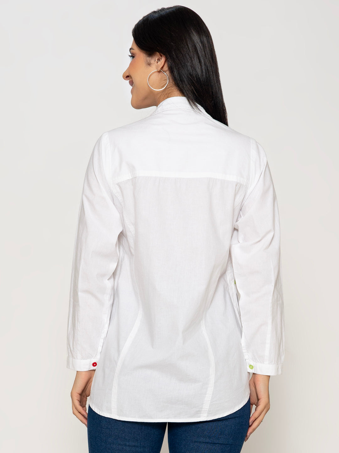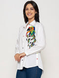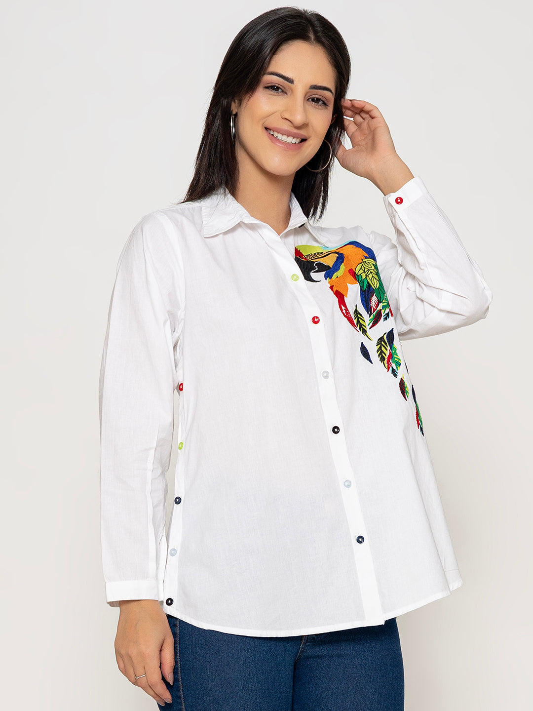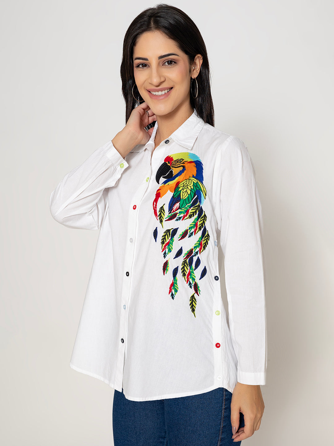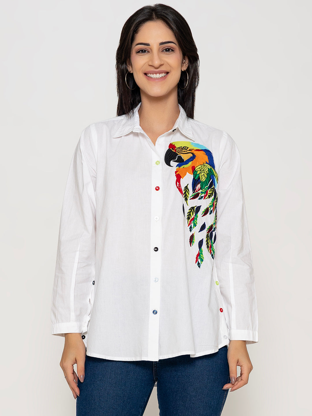 Channel effortless charm with this white shirt featuring a vibrant macaw-inspired front embroidery. Crafted from soft, breathable fabric, it’s a perfect blend of artistic expression and everyday comfort. The bold embroidery adds a pop of color and personality, making it an ideal pick for casual chic days or creative workspaces. Unique, lightweight, and easy to style—this shirt speaks volumes with subtle flair.